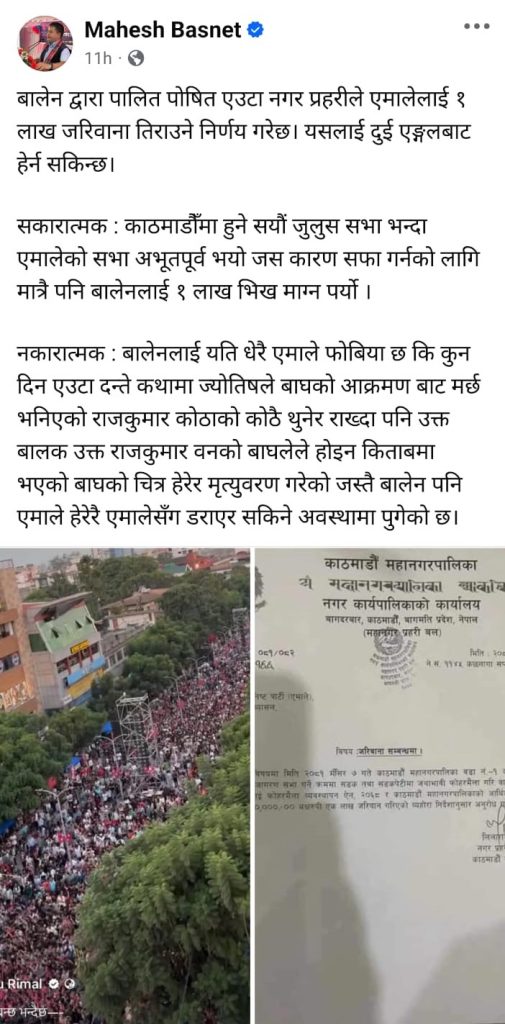 एमालेले सडक फोहोर गरेको भन्दै काठमाडौं महानगरपालिकाले एमालेलाई एक लाख रुपैयाँ जरिवाना तिराउने निर्णय गरेपछि बस्नेतले सामाजिक सञ्जाल फेसबुकमार्फत बालेनले एक लाख रुपैयाँ भिक मागेको बताएका हुन् ।