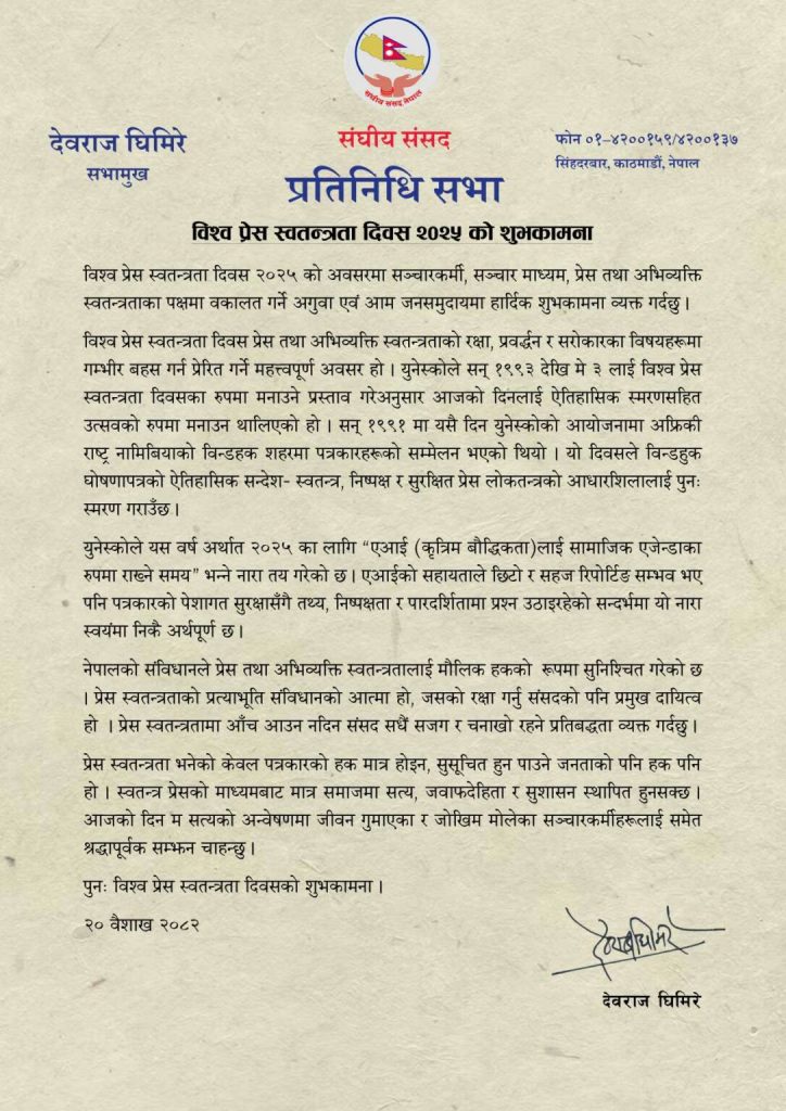 विश्व प्रेस स्वतन्त्रता दिवसको अवसरमा आज एक शुभकामना सन्देश जारी गर्दै सभामुख घिमिरेले प्रेस स्वतन्त्रतामा आँच आउन नदिन संसद सधैँ सजग र चनाखो रहने प्रतिबद्धता व्यक्त गरेका छन् ।