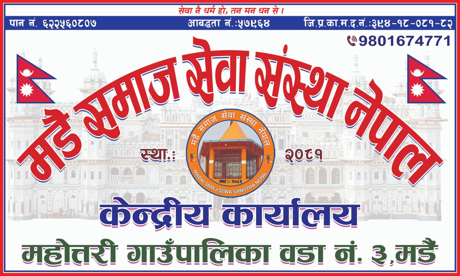 कात्तिक ०२ , जनकपुरधाम। समाजसेवाको निरन्तर यात्रामा लागिरहेको मडै समाज सेवा संस्था नेपालले आफ्नो कार्यालय उद्घाटन गर्दै नयाँ चरणमा प्रवेश गरेको छ। कात्तिक १ गते सम्पन्न उक्त समारोहले संस्थाको सामाजिक प्रतिबद्धतालाई झनै सुदृढ बनाएको छ।