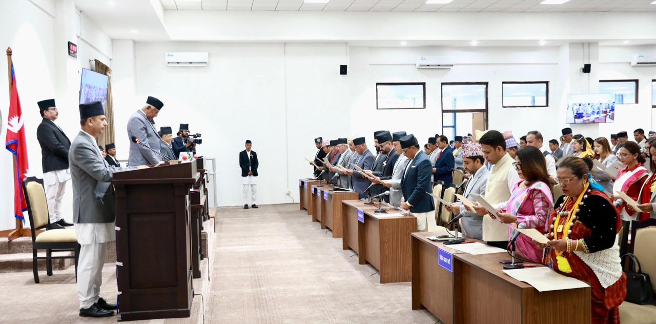 सिंहदरबारस्थित सङ्घीय संसद् सचिवालयको नवनिर्मित बहुउद्देश्यीय हलमा आज आयोजित समारोहमा प्रतिनिधिसभाका ज्येष्ठ सदस्य अर्जुननरसिंह केसीले उनीहरूलाई पद तथा गोपनीयताको शपथ गराएका हुन् ।