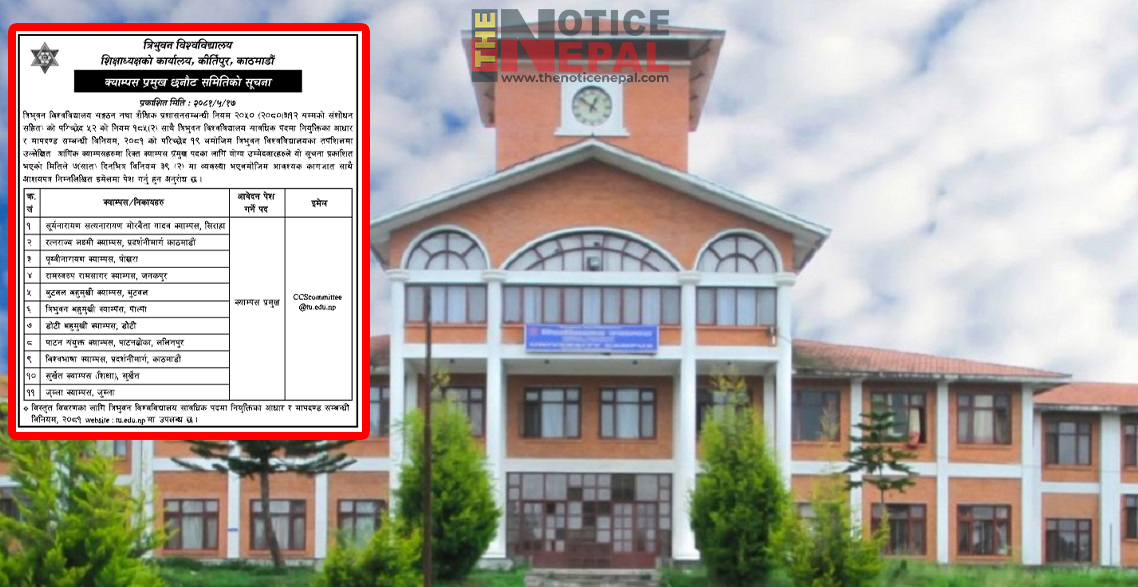 भाद्र १७, डेस्क। त्रिभुवन विश्वविद्यालय (त्रिवि) ले ११ आंगिक क्याम्पसमा रिक्त क्याम्पस प्रमुखका लागि दरखास्त..
