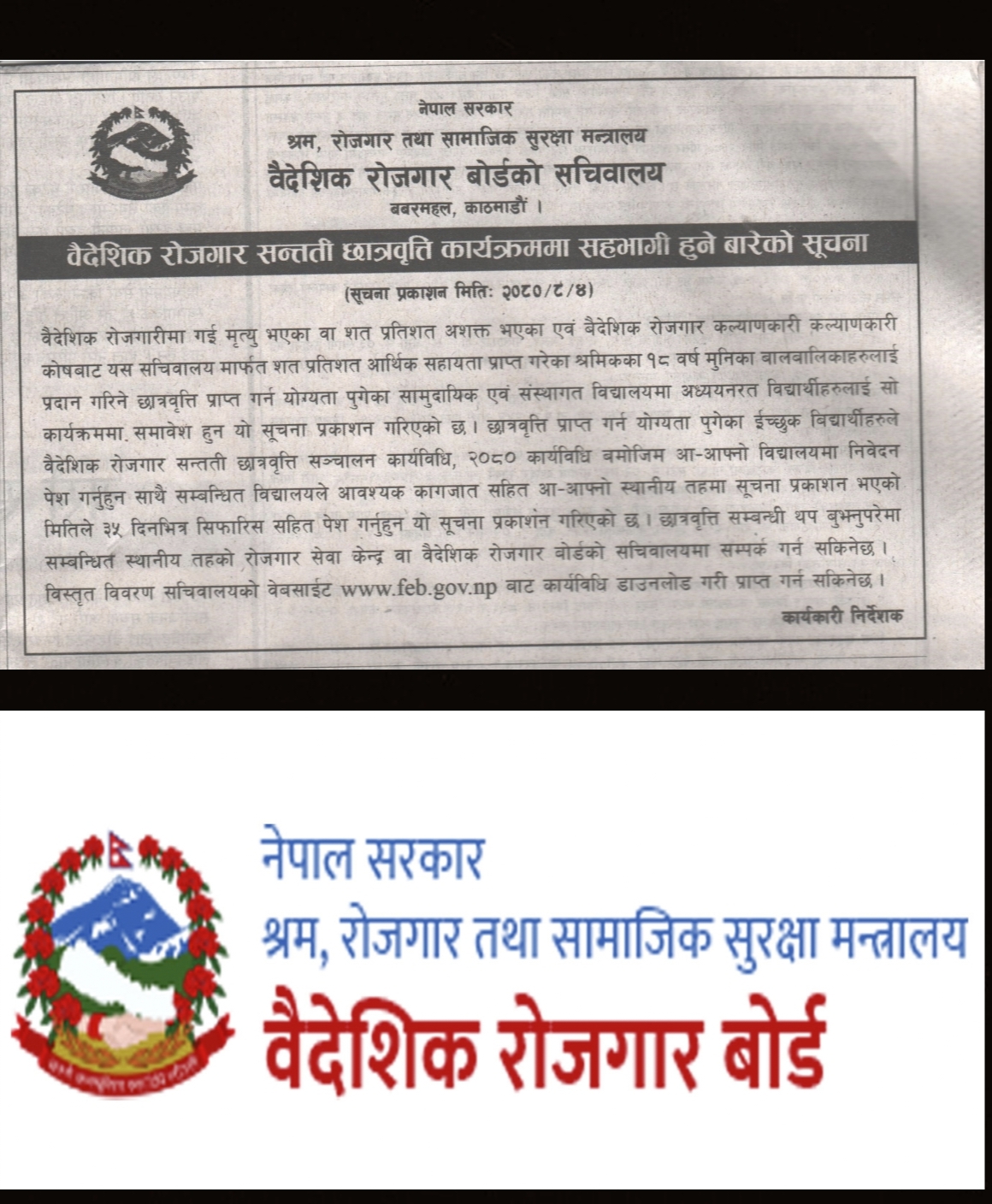 मंसिर ४,डेस्क। वैदेशिक रोजगार बोर्डको सचिवालयले वैदेशिक रोजगार सन्तति छात्रवृत्तिका लागि आवेदन आह्वान गरेको छ..