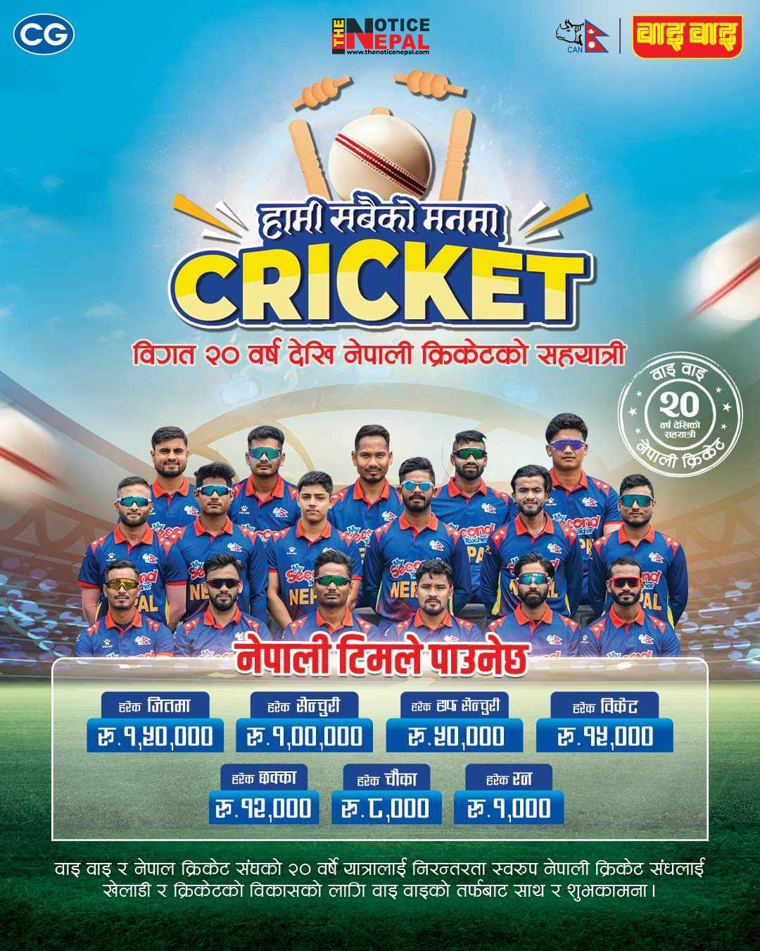 जेष्ठ २०,डेस्क । टी-२० विश्वकप क्रिकेटमा शतक हान्ने प्रत्येक नेपाली खेलाडीलाई वाइवाइले एक लाख प्रदान गर्ने..